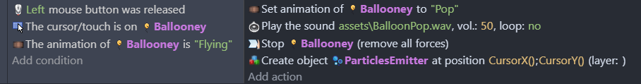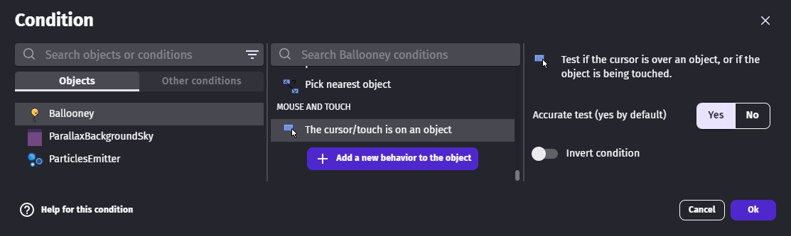This condition can be used with "Mouse button pressed" or "Mouse button released" to check if the object is clicked or taped.
